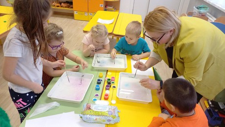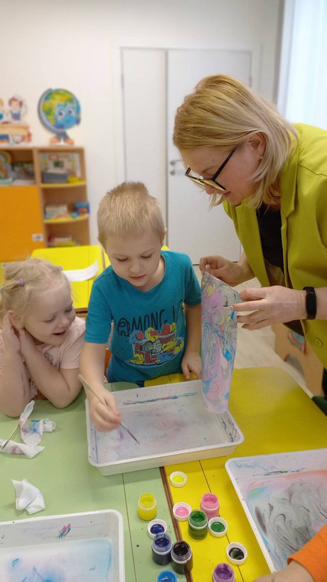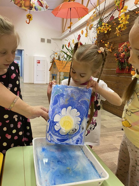 Рисование в технике Эбру является эффективным методом в работе с дошкольниками. Это занятие, увлекательное для всех без исключения, развивает творческое мышление, помогает расслабиться, тренирует координацию движений, стабилизирует психическое состояние. Наши педагоги активно применят рисование Эбру в коррекционных и развивающих целях.