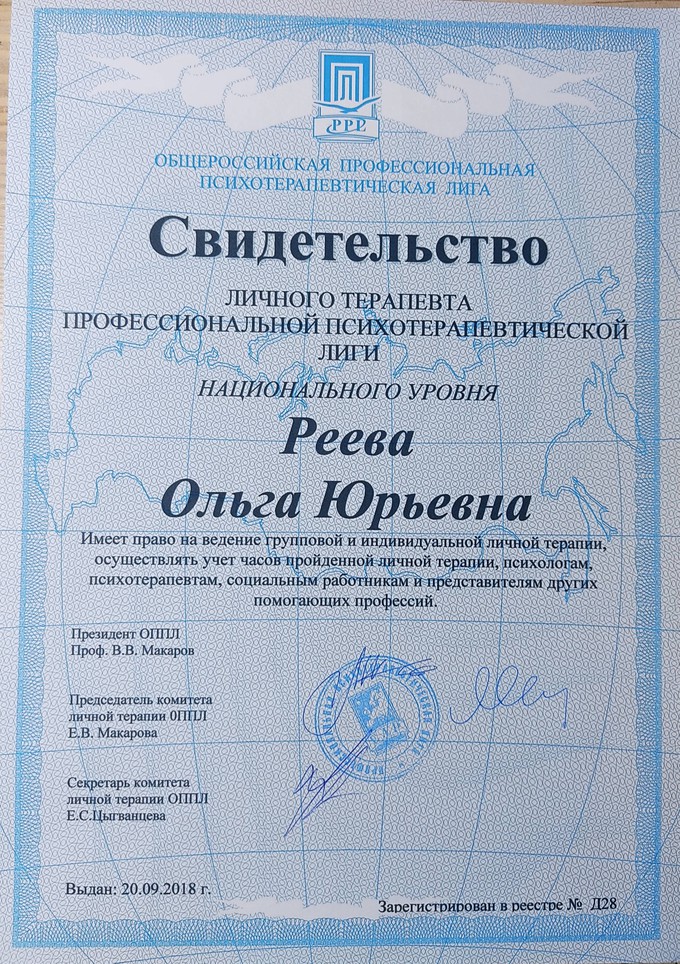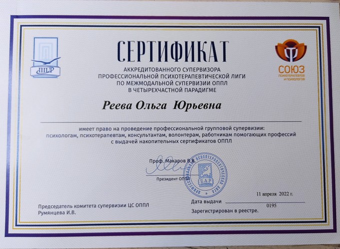 Аккредитованный ОППЛ: личный терапевт (2018), обучающий личный терапевт (2022), супервизор (2022)